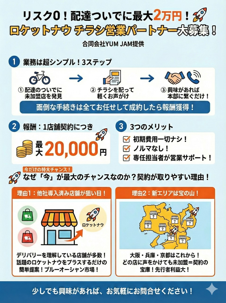 急拡大中で話題のフードデリバリー「rocket now(ロケットナウ)」のチラシ営業をしてくださる方を募集中です!