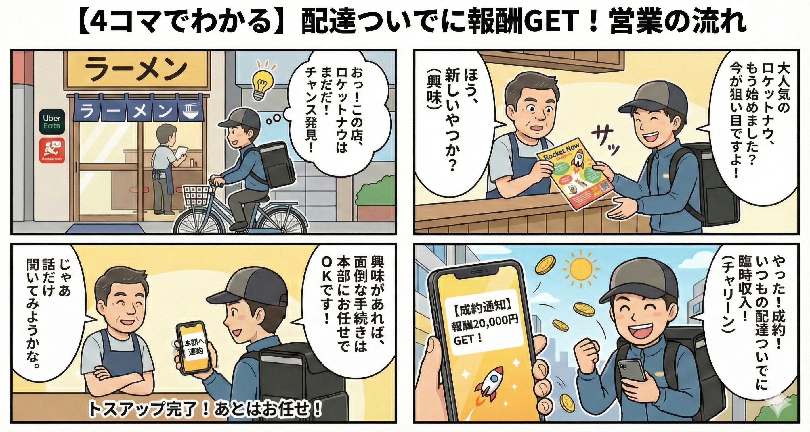 - ロケットナウにまだ加盟していない店舗を見つけて、チラシを配り軽く声掛けをするだけ!
